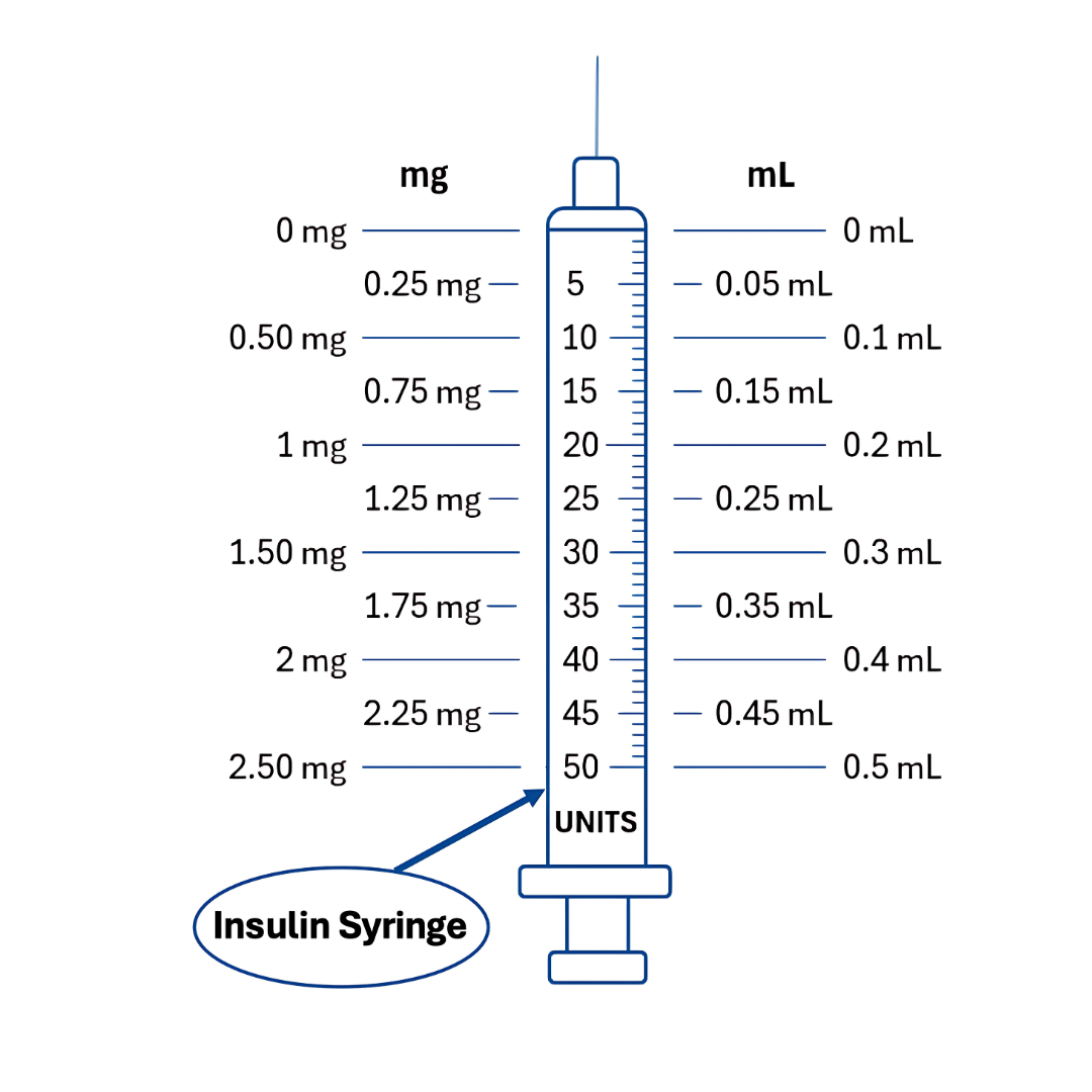 To convert mg to mL: Divide your mg dose by the concentration (e.g., 5 mg/mL).
